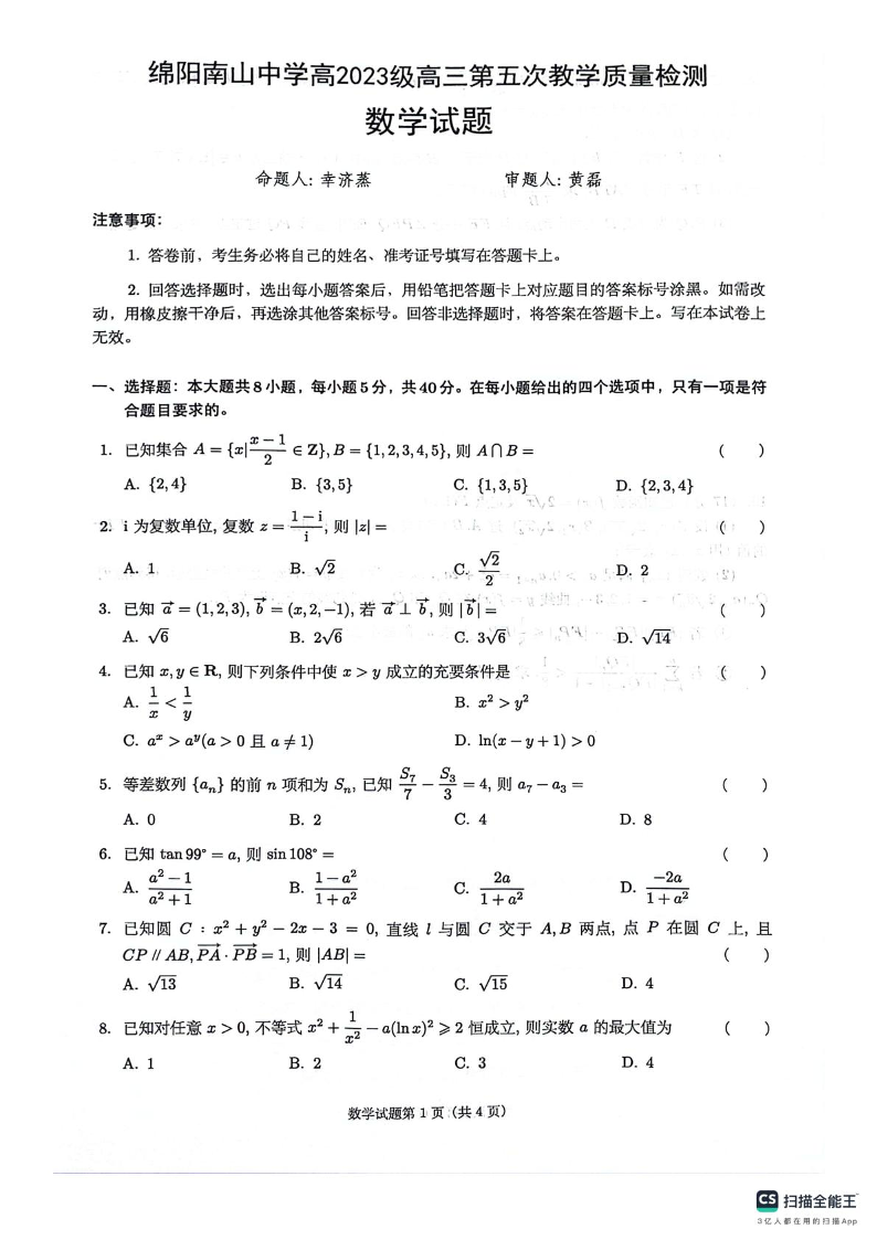高三数学+答案--四川省绵阳南山中学2026届高三上学期第五次教学质量检测(二模)