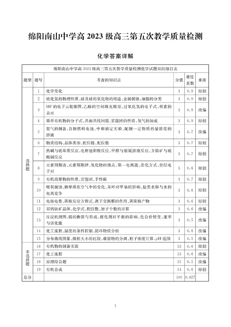 高三化学答案--四川省绵阳南山中学2026届高三上学期第五次教学质量检测(二模)
