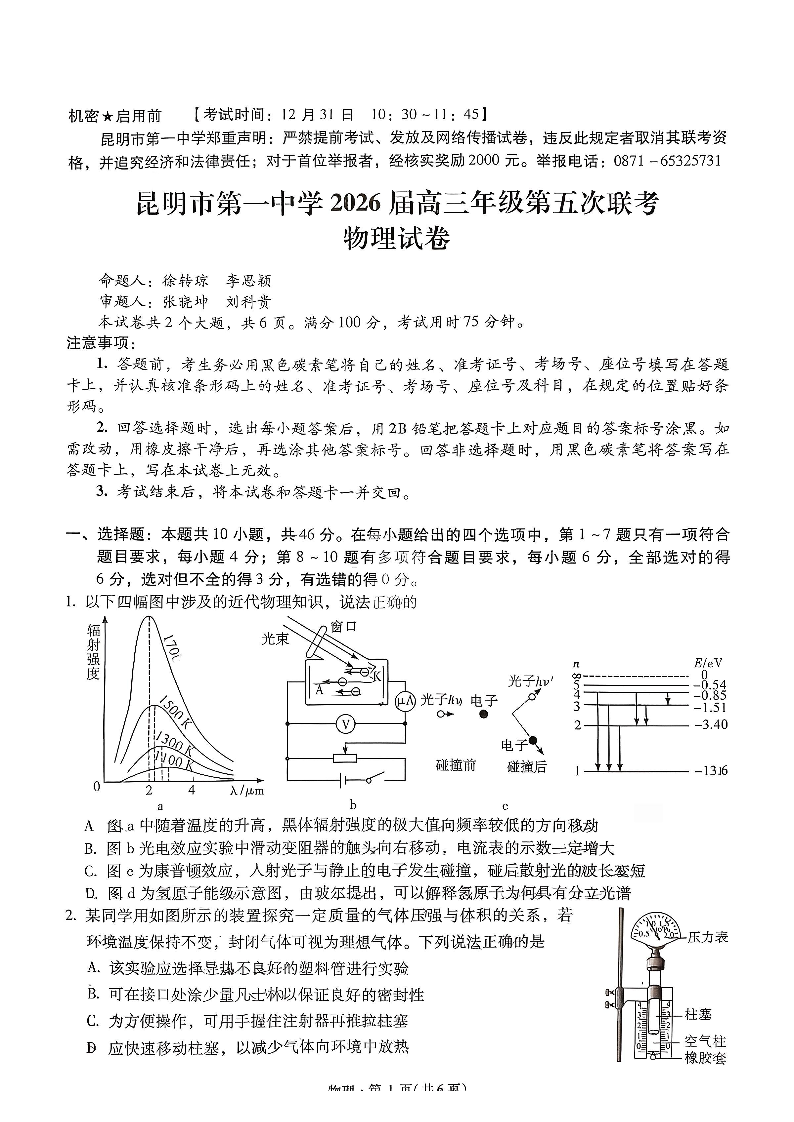 高三物理+答案--云南省昆明市第一中学2026届高三年级第五次联考