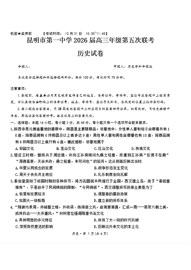 高三历史+答案--云南省昆明市第一中学2026届高三年级第五次联考