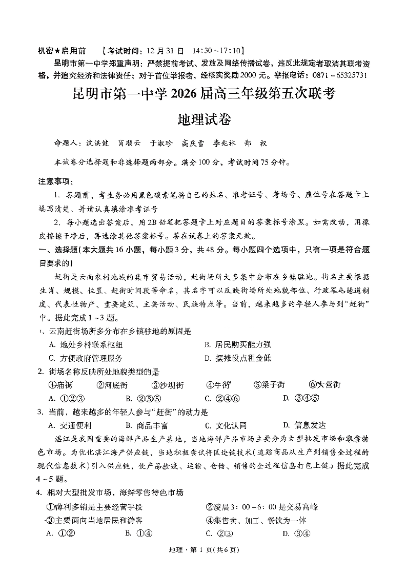 高三地理+答案--云南省昆明市第一中学2026届高三年级第五次联考