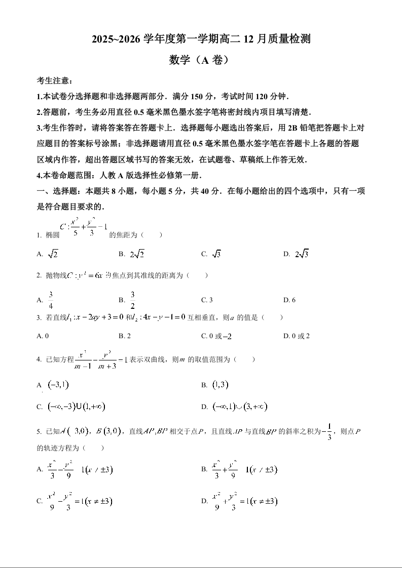 高二数学(原卷版)--安徽省县中联盟2025-2026学年高二上学期12月月考