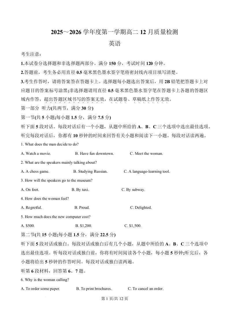 高二英语(原卷版)--安徽省县中联盟2025-2026学年高二上学期12月月考