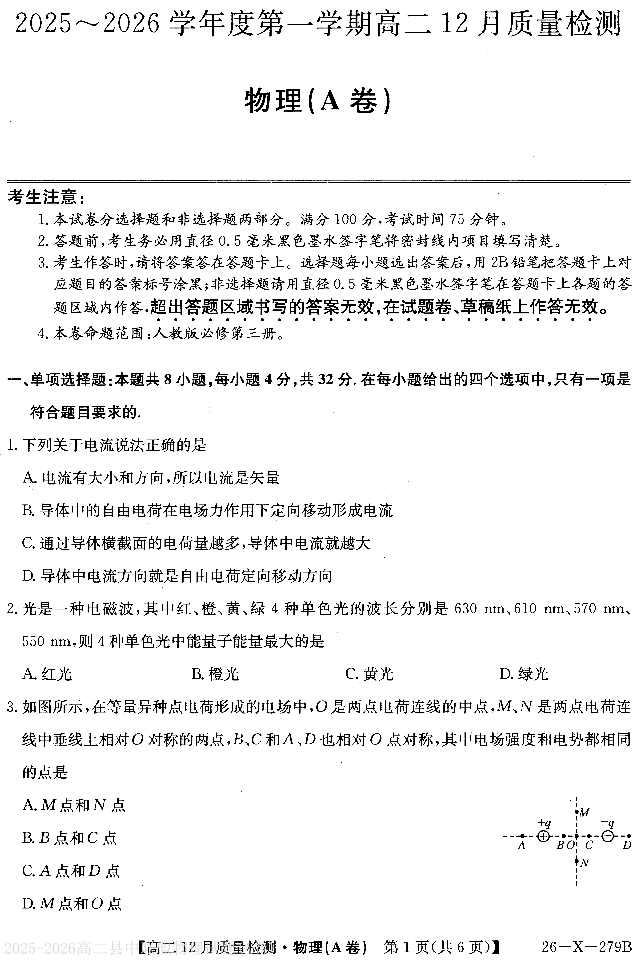 高二物理+答案--安徽省县中联盟2025-2026学年高二上学期12月月考