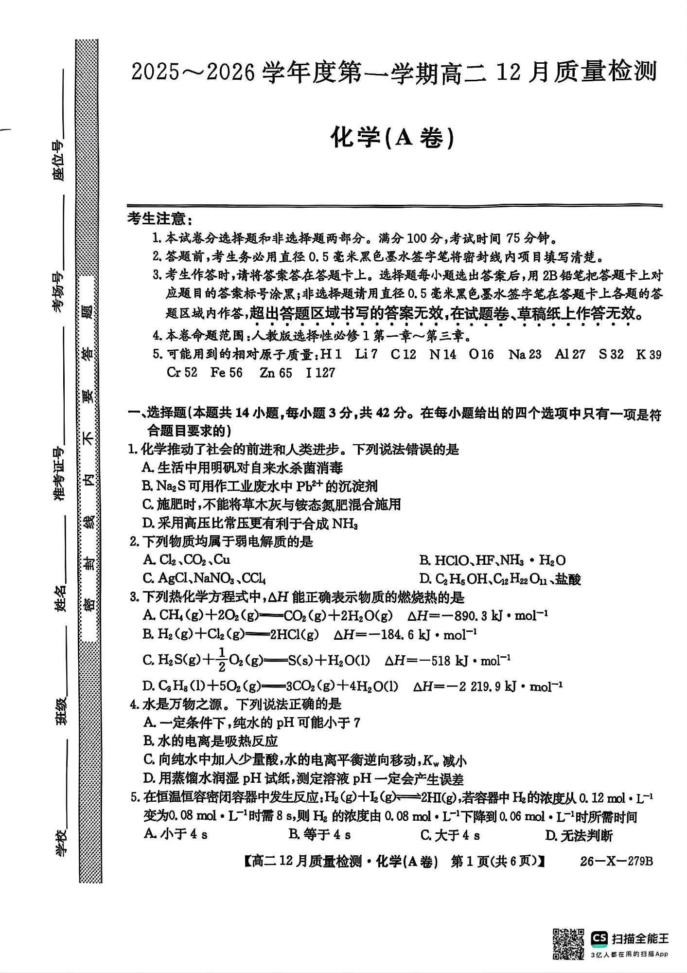 高二化学--安徽省县中联盟2025-2026学年高二上学期12月月考
