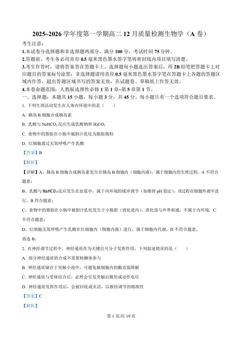 高二生物(解析版)--安徽省县中联盟2025-2026学年高二上学期12月月考