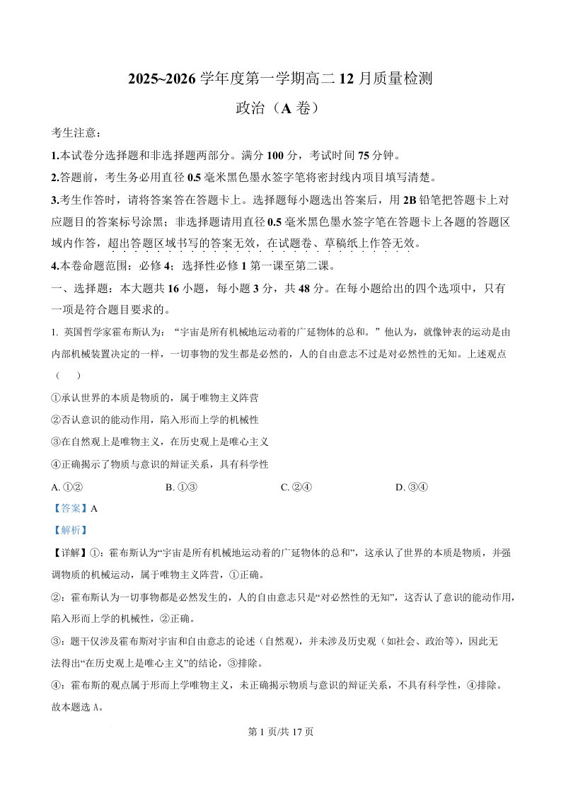 高二政治(解析版)--安徽省县中联盟2025-2026学年高二上学期12月月考