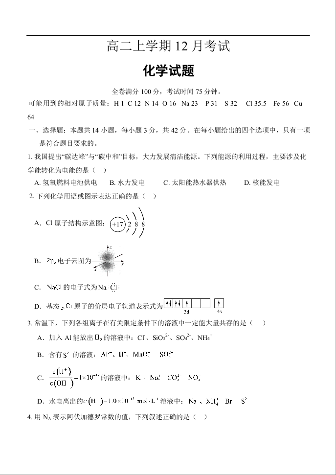 高二化学+答案--河北省保定市部分高中2025-2026学年高二上学期12月月考