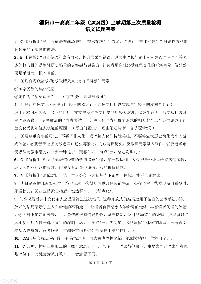 高二语文答案--河南省濮阳市第一高级中学2025-2026学年高二上学期1月月考