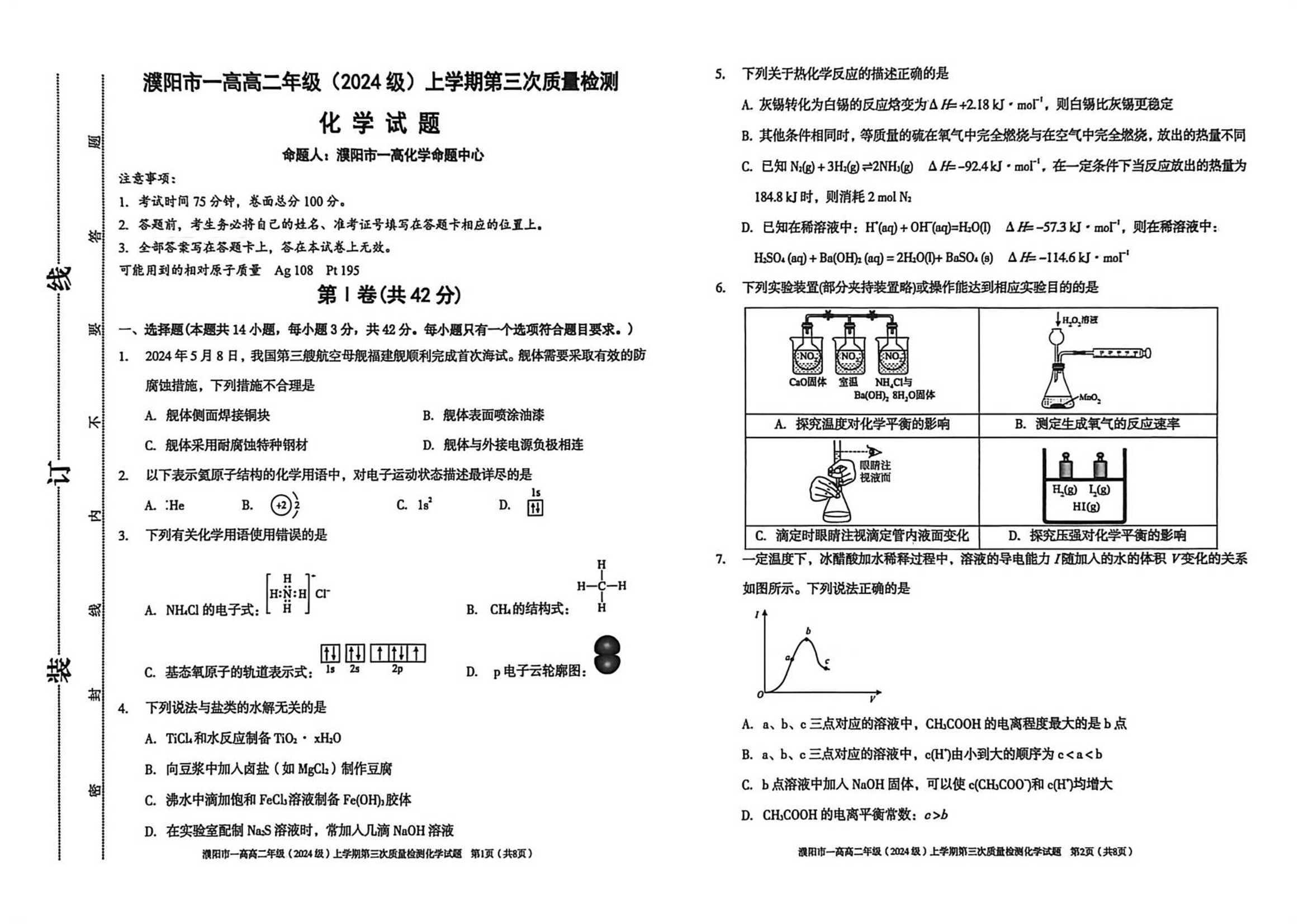 高二化学--河南省濮阳市第一高级中学2025-2026学年高二上学期1月月考