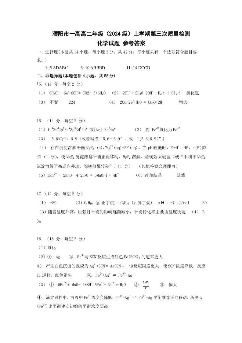 高二化学答案--河南省濮阳市第一高级中学2025-2026学年高二上学期1月月考