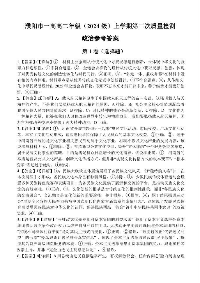 高二政治答案--河南省濮阳市第一高级中学2025-2026学年高二上学期1月月考