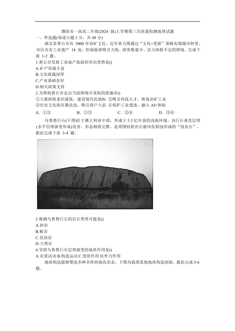 高二地理+答案--河南省濮阳市第一高级中学2025-2026学年高二上学期1月月考