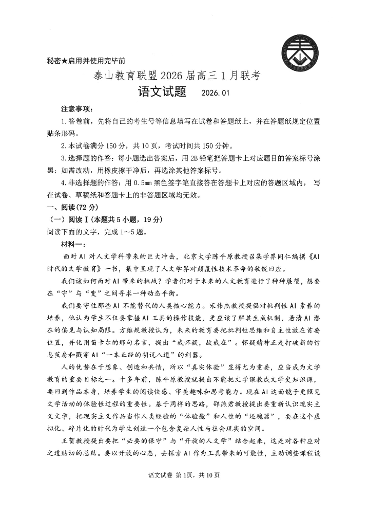 高三语文--山东省实验中学泰山联盟2026.1联考