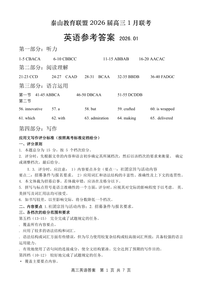 高三英语答案--山东省实验中学泰山联盟2026.1联考