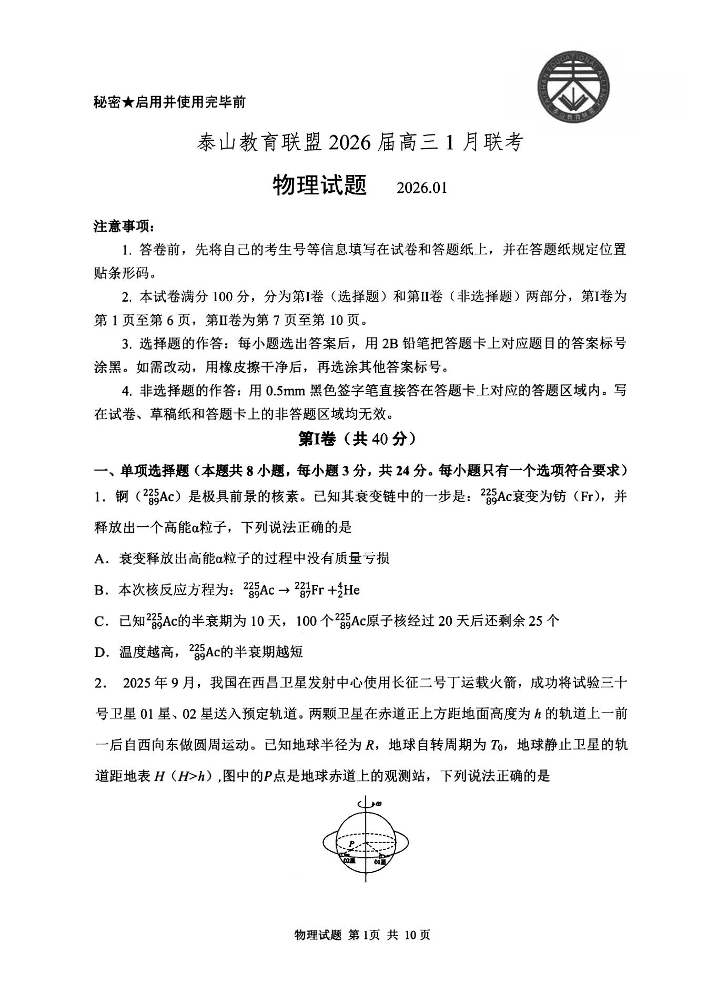 高三物理--山东省实验中学泰山联盟2026.1联考