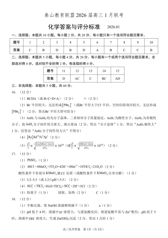 高三化学答案--山东省实验中学泰山联盟2026.1联考