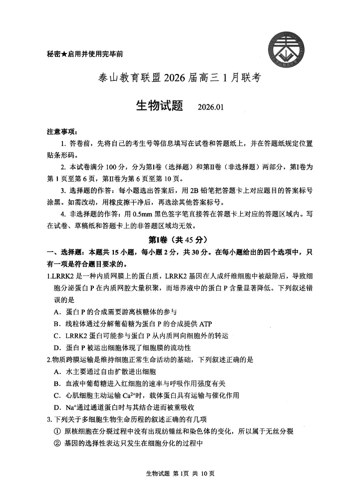 高三生物--山东省实验中学泰山联盟2026.1联考