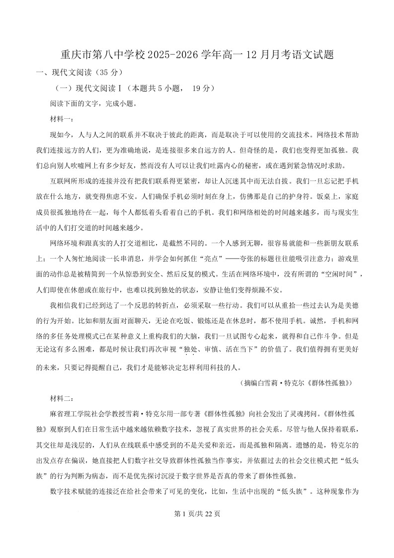 高一语文(解析版)--重庆市第八中学2025-2026学年高一上学期12月月考