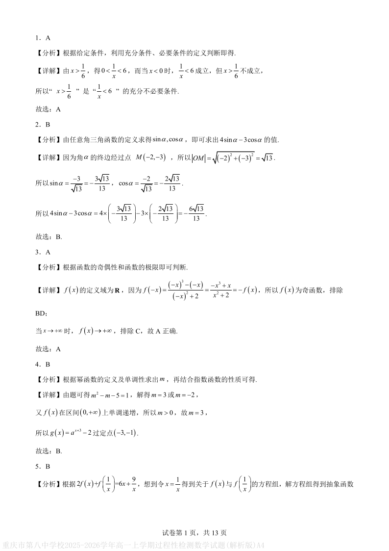 高一数学(解析版)--重庆市第八中学2025-2026学年高一上学期12月月考