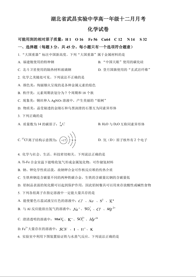 高一化学(原卷版)--湖北省武汉市武昌实验中学2025-2026学年高一上学期12月月考