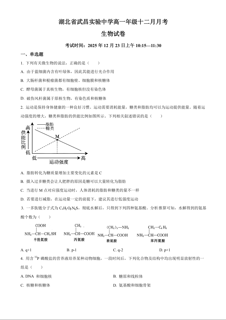 高一生物(原卷版)--湖北省武汉市武昌实验中学2025-2026学年高一上学期12月月考