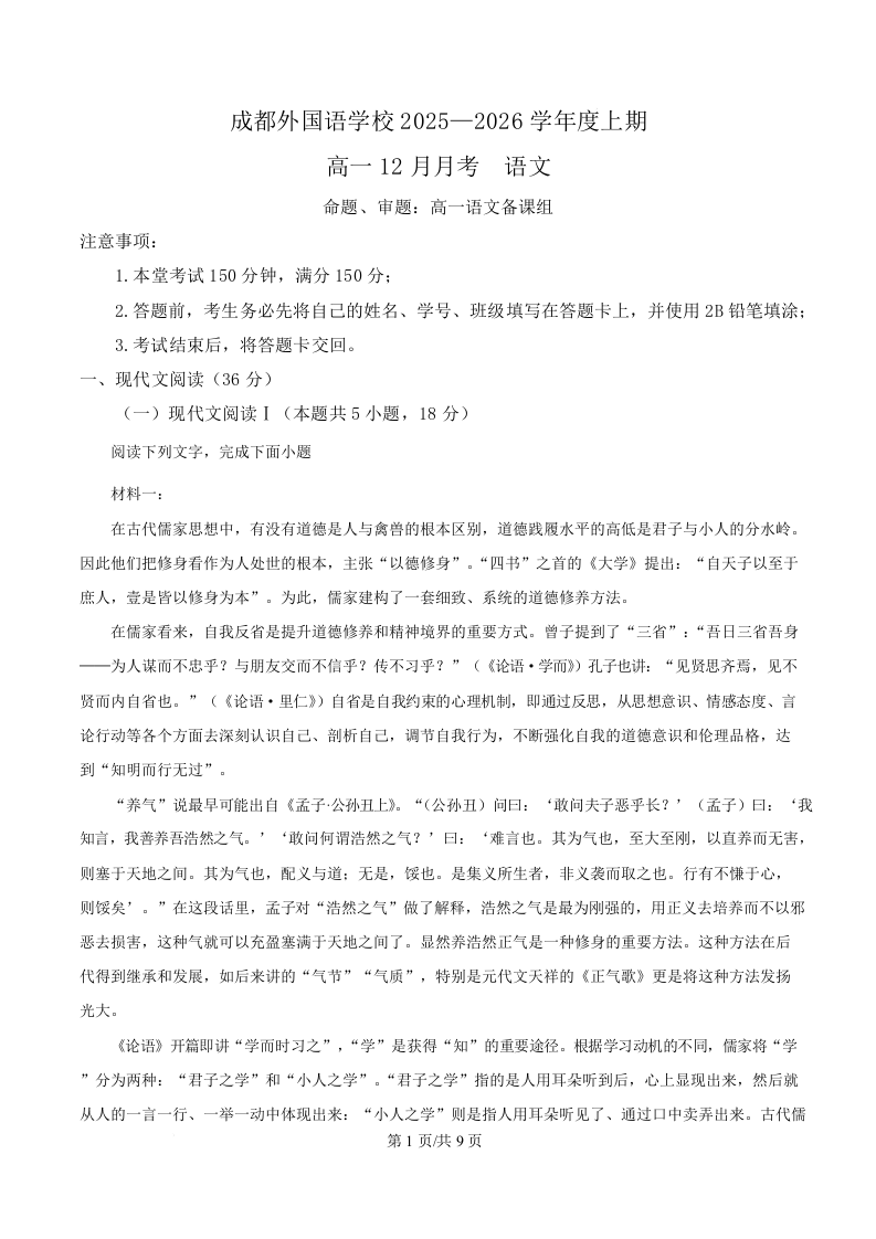 高一语文(原卷版)--四川省成都外国语学校2025-2026学年高一上学期12月月考