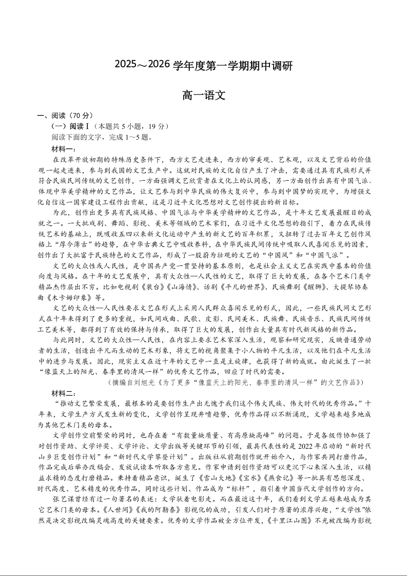 高一语文+答案--江苏省盐城市多校2025-2026学年高一上学期期中考试