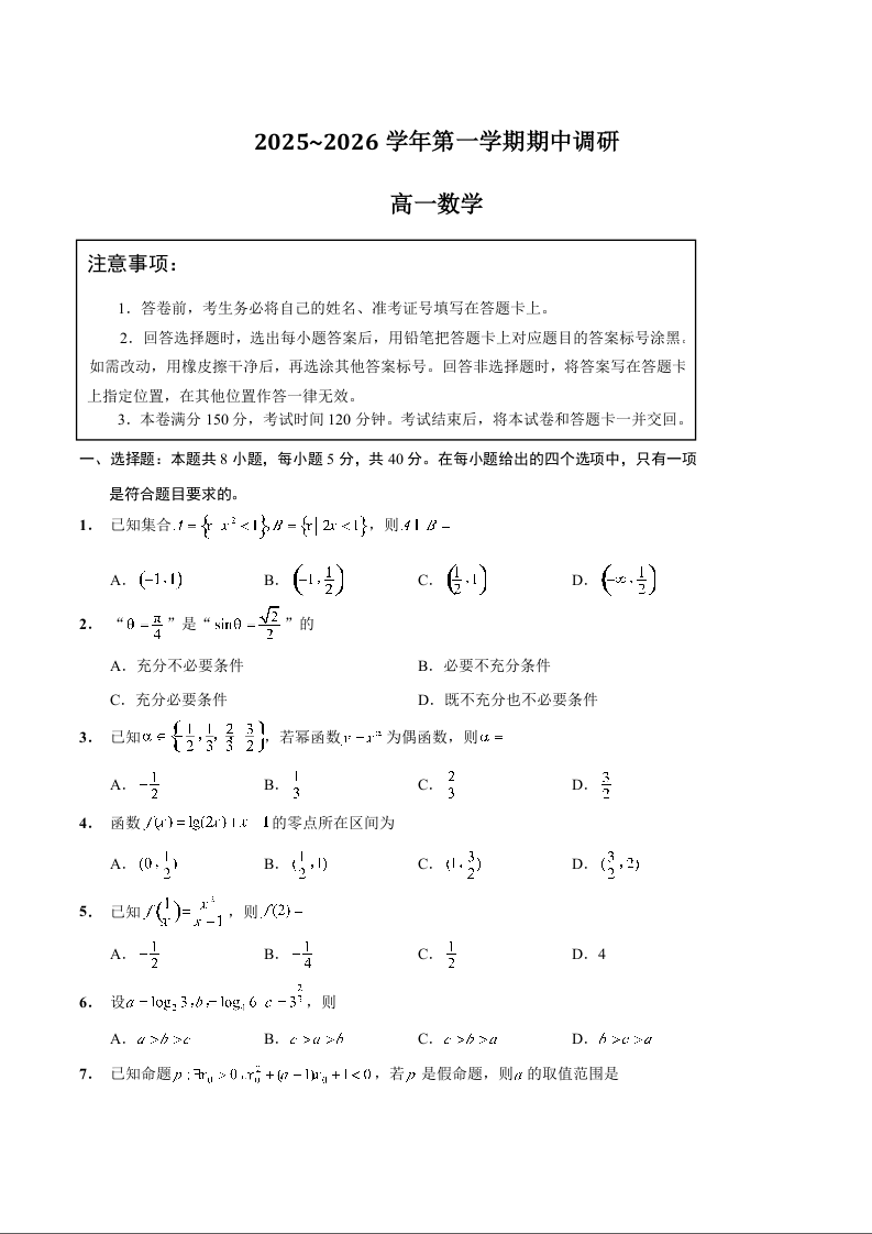 高一数学+答案--江苏省盐城市多校2025-2026学年高一上学期期中考试