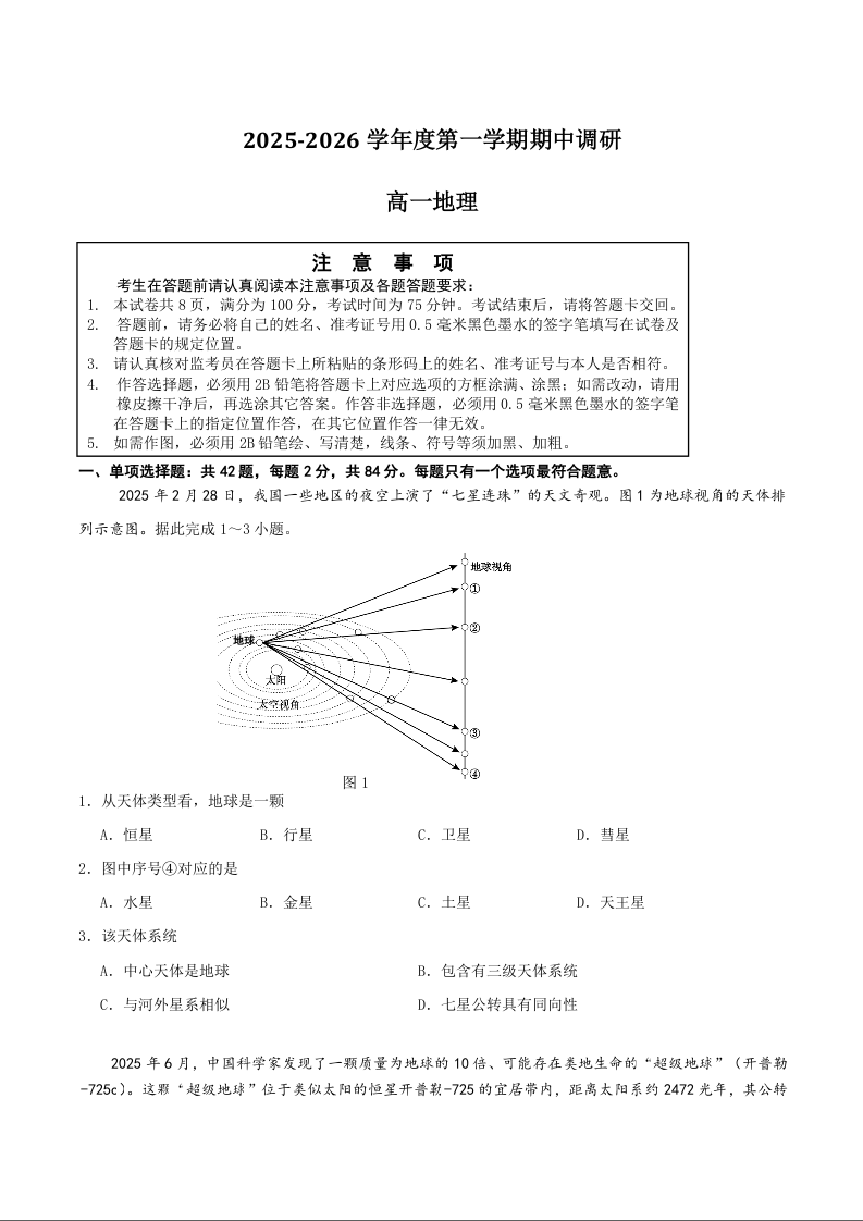 高一地理+答案--江苏省盐城市多校2025-2026学年高一上学期期中考试