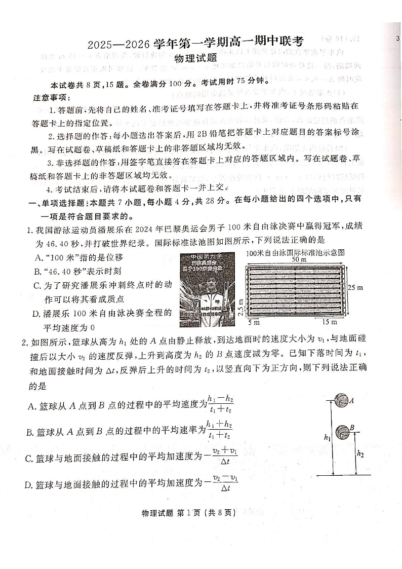 高一物理+答案--陕西省安康市2025-2026学年高一上学期期中联考