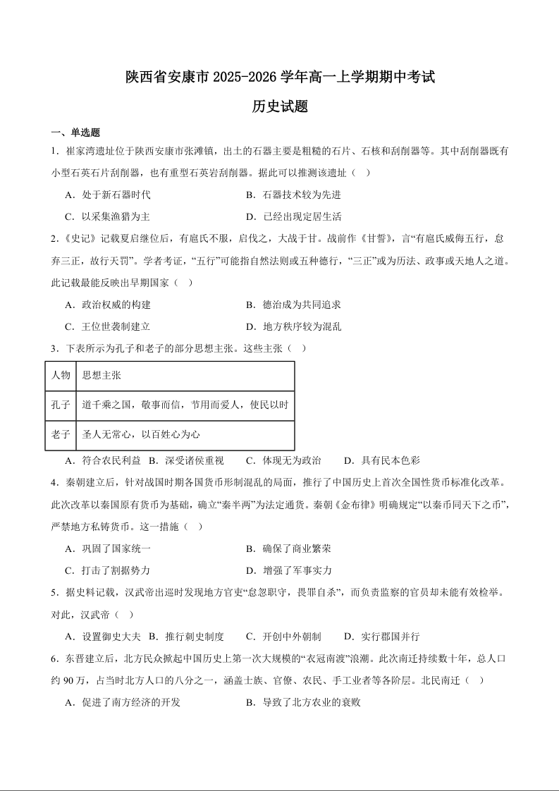 高一历史+答案--陕西省安康市2025-2026学年高一上学期期中联考