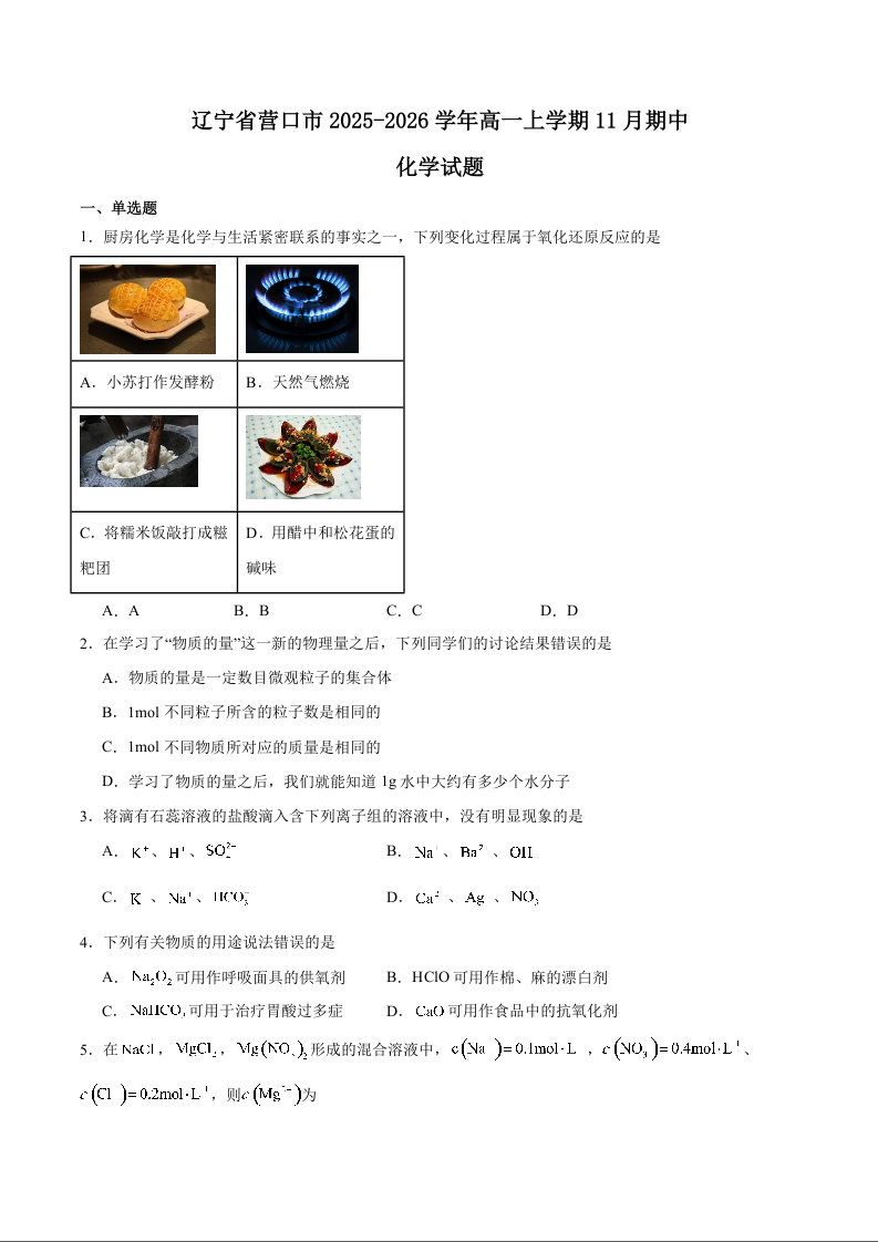 高一化学+答案--辽宁省营口市2025-2026学年高一上学期期中考试