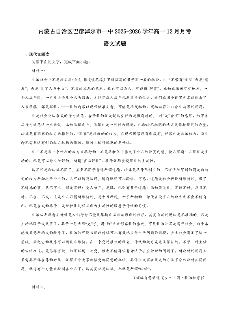 高一语文+答案--内蒙古巴彦淖尔市第一中学2025-2026学年高一上学期12月月考