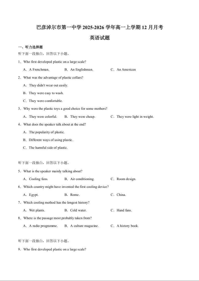 高一英语+答案--内蒙古巴彦淖尔市第一中学2025-2026学年高一上学期12月月考