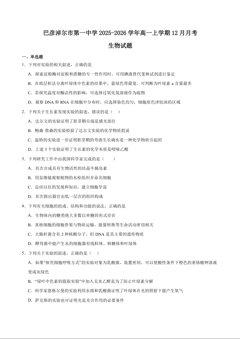 高一生物+答案--内蒙古巴彦淖尔市第一中学2025-2026学年高一上学期12月月考