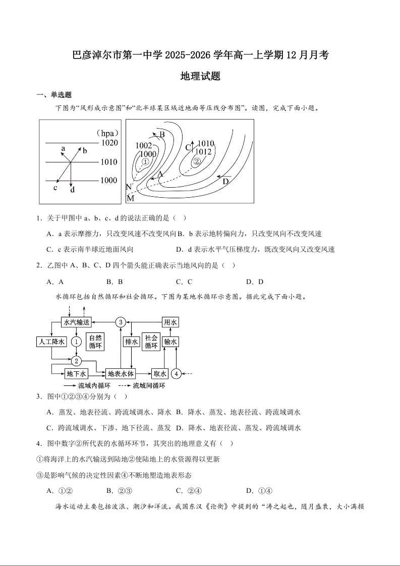 高一地理+答案--内蒙古巴彦淖尔市第一中学2025-2026学年高一上学期12月月考