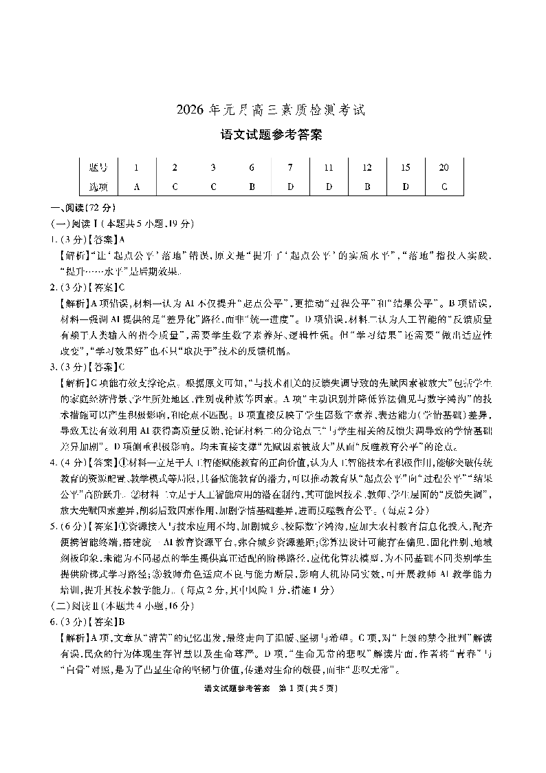 高三语文答案--安徽六校教育研究会2026届元月高三素质检测考试