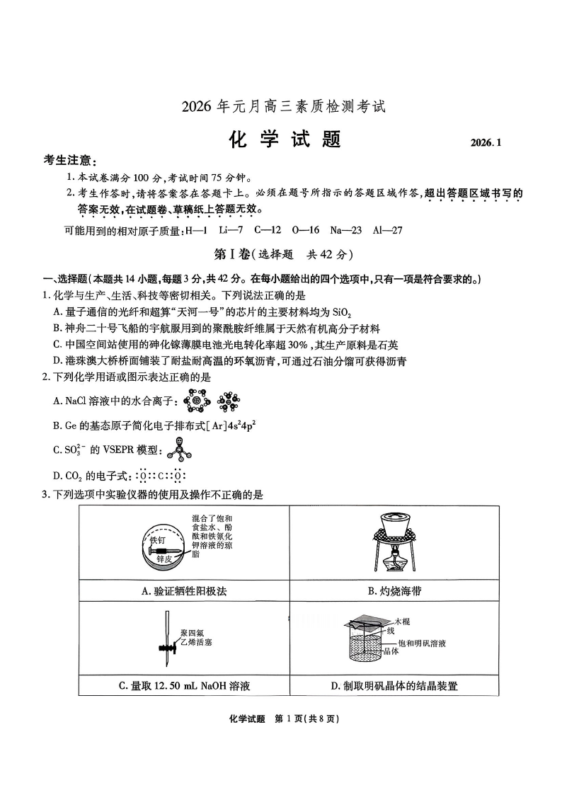 高三化学--安徽六校教育研究会2026届元月高三素质检测考试