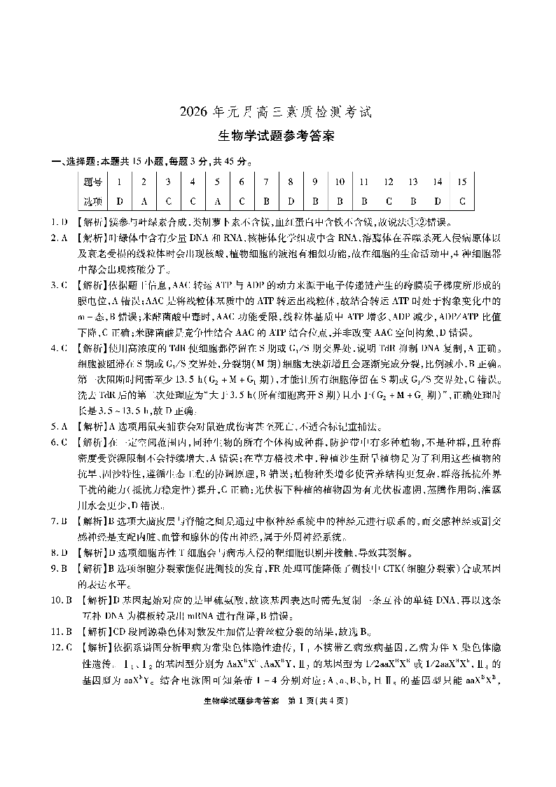 高三生物答案--安徽六校教育研究会2026届元月高三素质检测考试