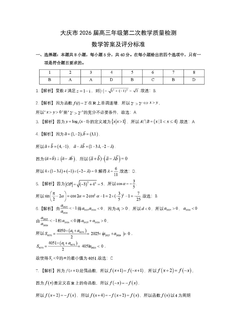 高三数学答案--黑龙江省大庆市2026届高三第二次教学质量检测(大庆二模)