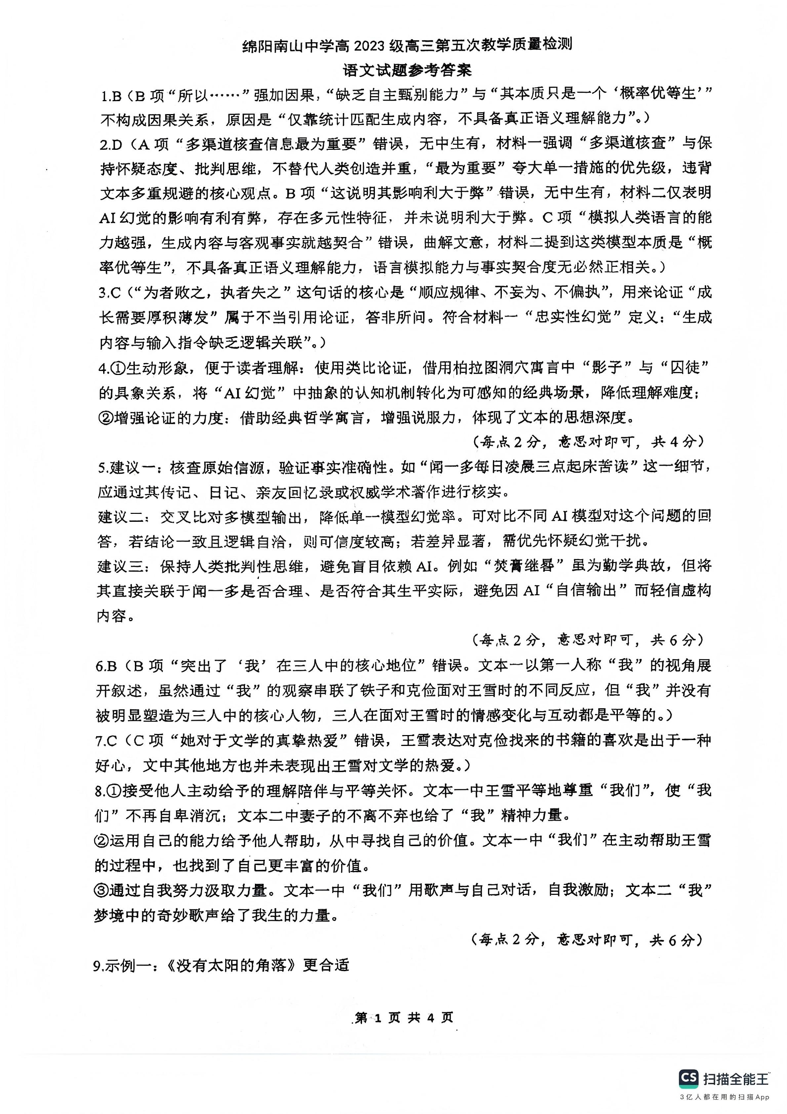 高三语文答案--四川省绵阳南山中学高2023级高三第五次教学质量检测