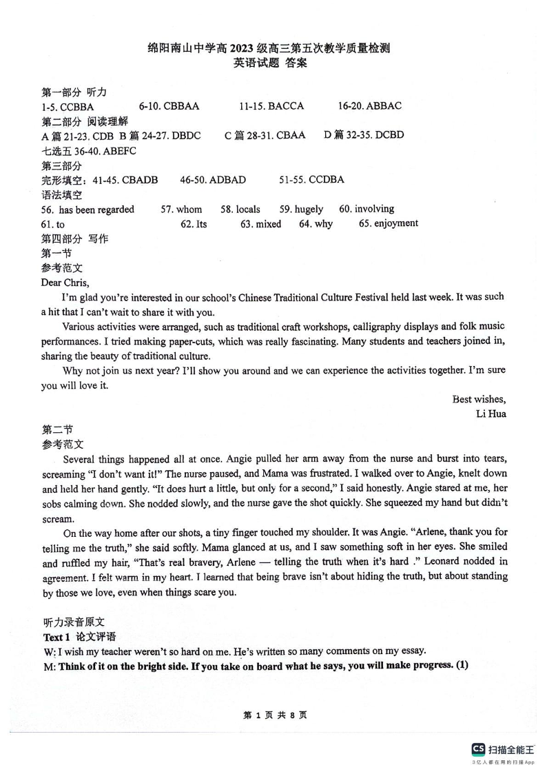 高三英语答案--四川省绵阳南山中学高2023级高三第五次教学质量检测