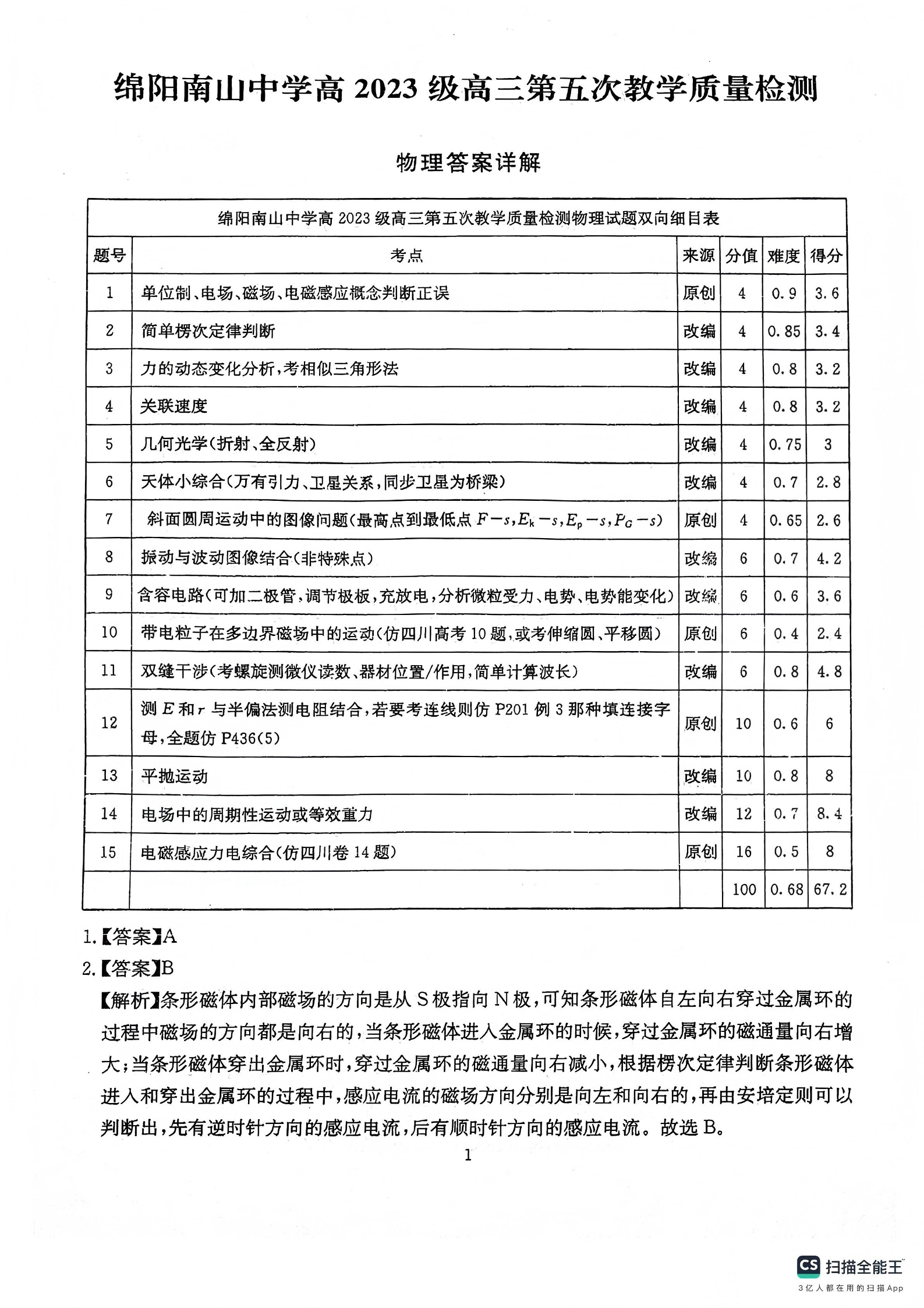 高三物理答案--四川省绵阳南山中学高2023级高三第五次教学质量检测