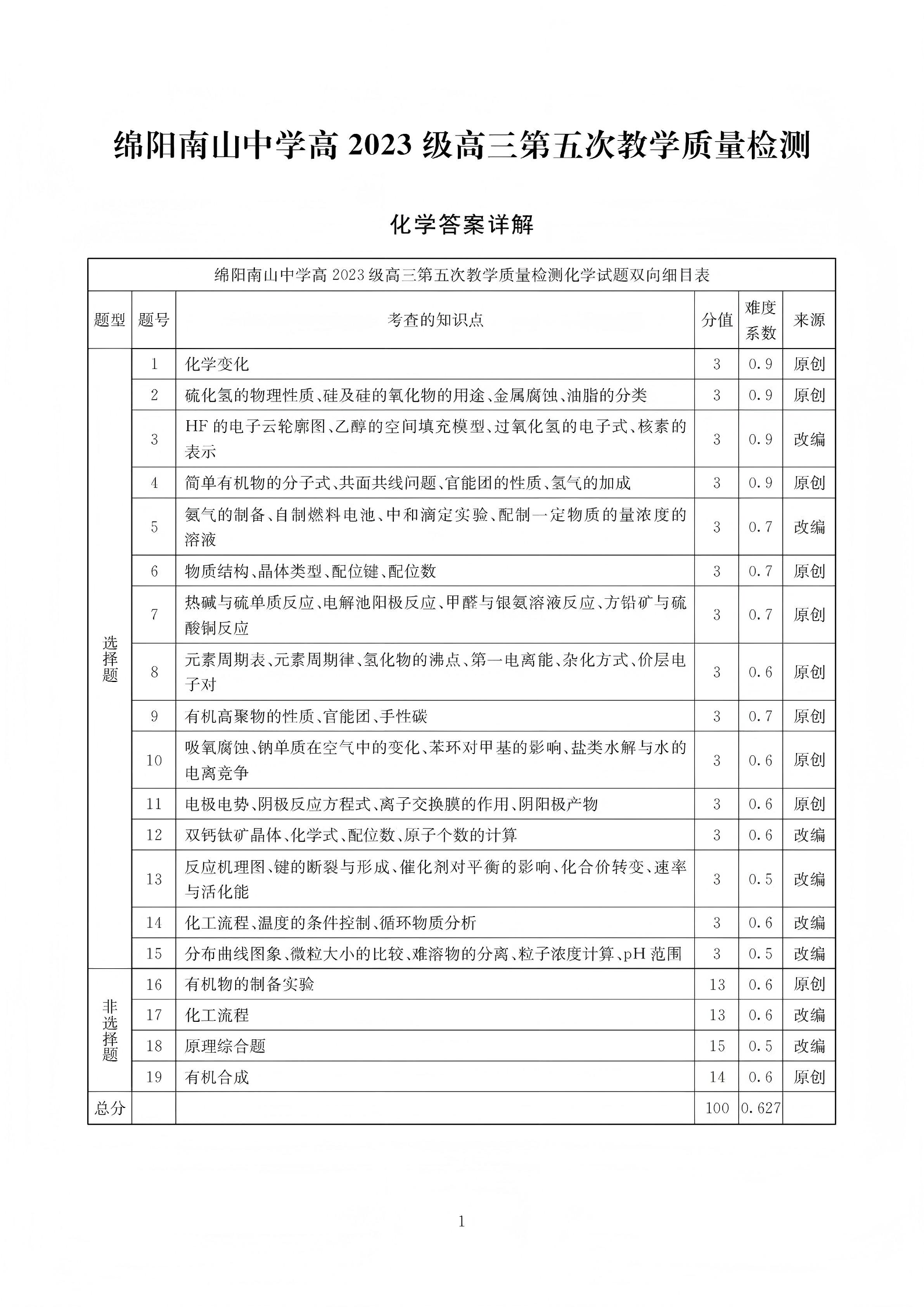 高三化学答案--四川省绵阳南山中学高2023级高三第五次教学质量检测