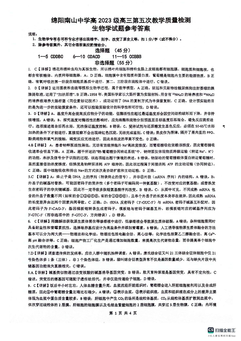 高三生物答案--四川省绵阳南山中学高2023级高三第五次教学质量检测