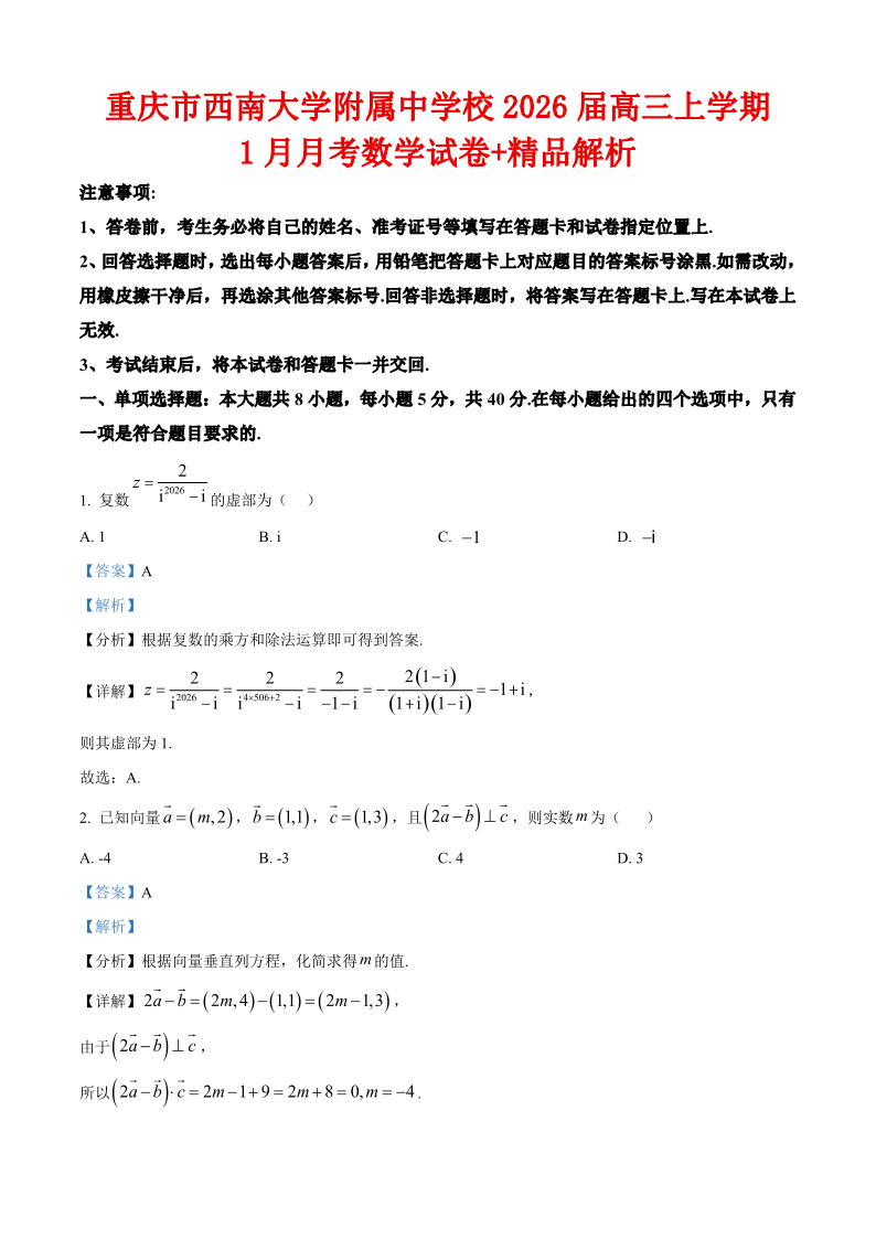 高三数学(解析版)--重庆市西南大学附属中学校2026届高三上学期1月定时检测(一诊)
