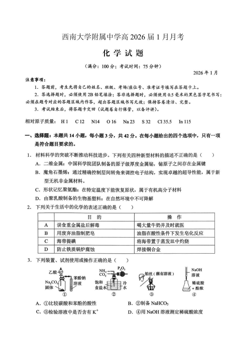 高三化学--重庆市西南大学附属中学校2026届高三上学期1月定时检测(一诊)