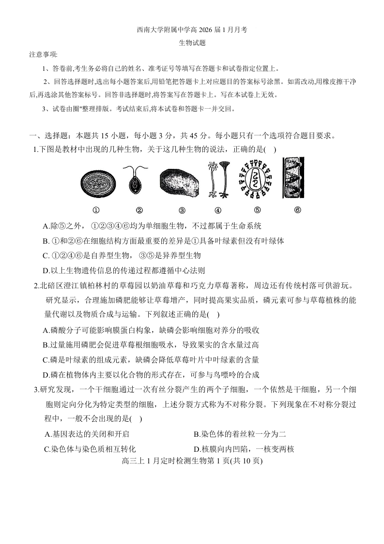 高三生物--重庆市西南大学附属中学校2026届高三上学期1月定时检测(一诊)