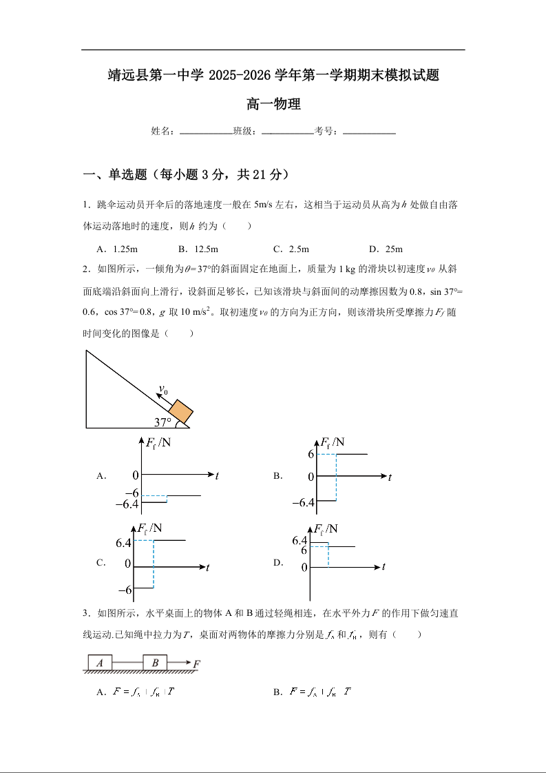 高一物理+答案--甘肃省白银市靖远县第一中学2025-2026学年高一上学期12月月考